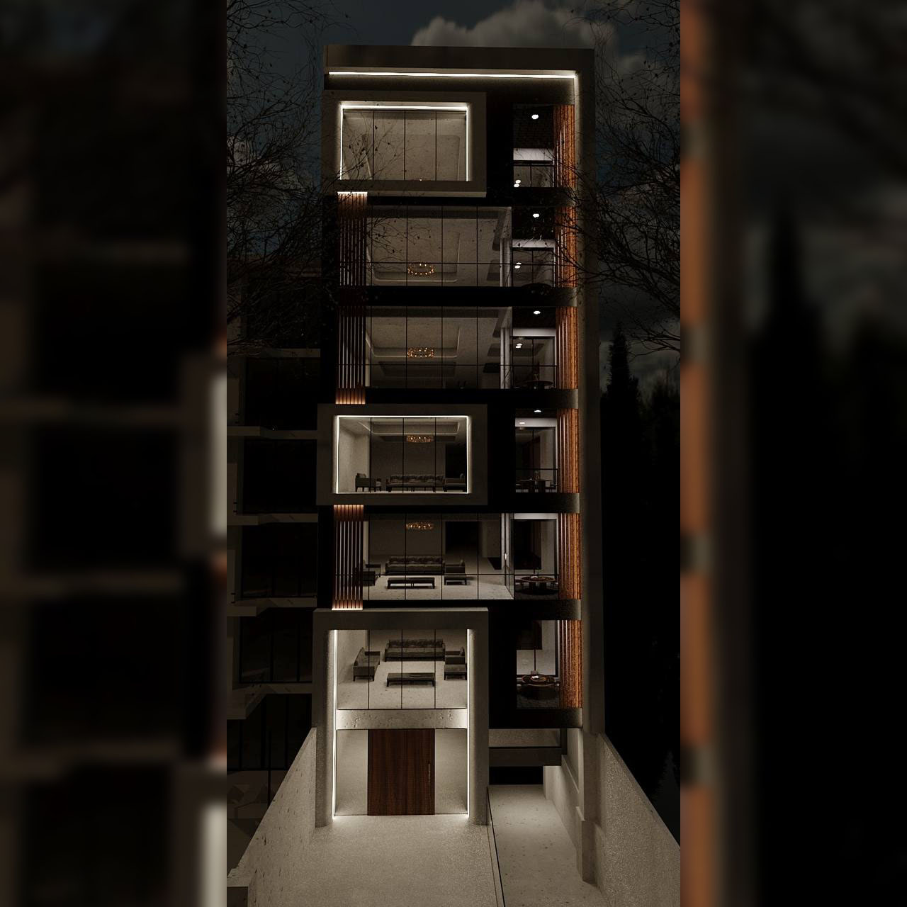 با غروب آفتاب، فلسفه طراحی هاشمیه ۱۲ از طریق نورپردازی خطی و یکپارچه آن تداوم می‌یابد. به جای نورافکن‌های سنتی، از نوارهای نوری (LED) برای ترسیم و تاکید بر خطوط هندسی قاب‌ها و احجام استفاده شده است. این تکنیک، ساختار معماری پروژه را در شب نیز زنده نگه می‌دارد و جلوه‌ای شیک، مینیمال و بسیار امروزی به آن می‌بخشد. نورپردازی ملایم بر روی پانل‌های چوبی و نور گرم فضاهای داخلی که از پشت شیشه‌ها نمایان است، ترکیبی از زیبایی بصری و حس دعوت‌کنندگی را ایجاد می‌کند.